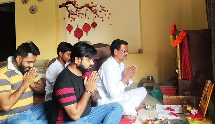 अमेठी के कायस्थाना मोहल्ले में भगवान चित्रगुप्त व कलम दवात की पूजा करते लोग। –