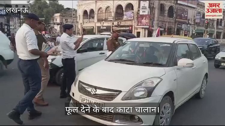 यातायात माह की शुरुआत मंगलवार से हो गई है। हजरतगंज चौराहे पर यातायात नियमों का पालन न करने वालों को पुलिस ने फूल देने के बाद चालान काटा।