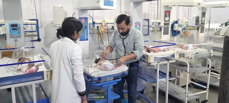 संयुक्त जिला चिकित्सालय के एसएनसीयू र्वाउ में निमोनिया से ग्रसित बच्चे को देखते चिकित्सक।