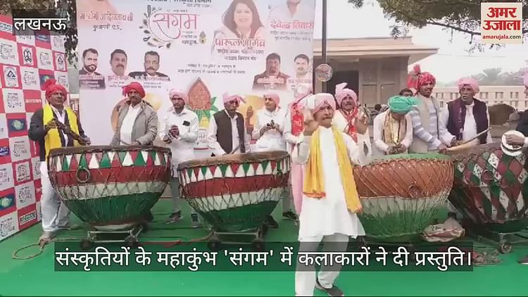 संस्कृतियों के महाकुंभ ‘संगम’ में मथुरा के नंदराम बरसाना से आए कलाकारों ने नगाड़ा बजाकर प्रस्तुति दी।