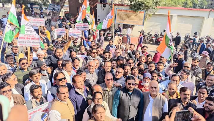 झांसी- उत्तर प्रदेश कांग्रेस कमेटी के अध्यक्ष अजय राय के निर्देशानुसार शनिवार को जिला कांग्रेस कमेटी के तत्वाधान में कचहरी चौराहा स्थित महात्मा गांधी उद्यान में सैकड़ो की संख्या में पहुंचकर कांग्रेस कार्यकर्ताओं ने कार्यवाहक जिलाध्यक्ष योगेंद्र सिंह पारीछा की अध्यक्षता में विगत 26 दिसंबर को जिला प्रशासन की शह पर पुलिस द्वारा केंद्रीय मंत्री प्रदीप जैन आदित्य व 50 किसानों पर दर्ज फर्जी मुकदमा वापस लिए जाने की मांग को लेकर धरना दिया। बाद में पूर्व विधायक बृजेन्द्र कुमार व्यास उर्फ डमडम महाराज के नेतृत्व में महामहिम राज्यपाल को संबोधित ज्ञापन उप जिलाधिकारी को भेंट किया गया।