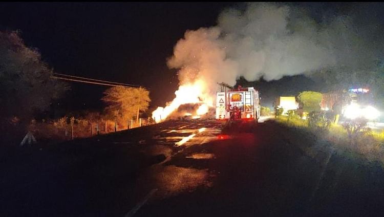 एट (जालौन)। माचिस की पेटियां लादकर कानपुर जा रहे ट्रक में अचानक आ लग गई। चालक कुछ समझ पाता कि आग ने विकराल रूप धारण कर लिया और कुछ ही देर में ट्रक आग का गोला बन गया। चालक ने कूदकर अपनी जान बचाकर पुलिस को सूचना दी। सूचना पर पुलिस व फायर टीम मौके पर पहुंची और करीब एक घंटे बाद आग पर काबू पाया गया। तब तक ट्रक पूरी तरह से जल चुका था।