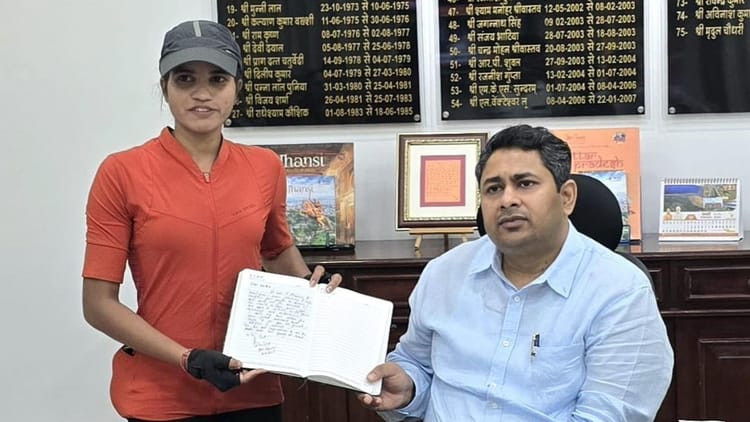 मध्य प्रदेश के राजगढ़ जिले की निवासी आशा मालवीय नारी शक्ति, देशभक्ति और अदम्य साहस का संदेश लेकर 7800 किलोमीटर की साइकिल यात्रा पर निकली हैं। जयपुर से शुरू हुई उनकी यात्रा गुजरात होते हुए कन्याकुमारी तक जाएगी। झांसी पहुंचने पर स्थानीय लोगों ने उनका स्वागत किया।