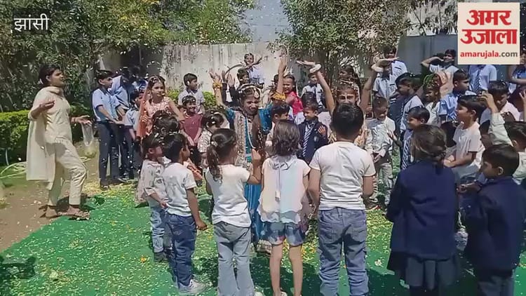 झांसी में सीपरी बाजार के इ्रीम इंडिया स्कूल के बच्चों ने राधाकृष्ण के स्वरूप में खेली फूलों की होली
