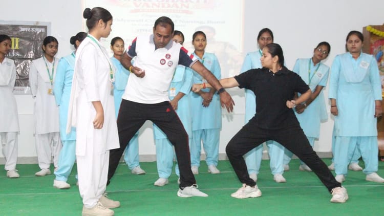 अमर उजाला फाउंडेशन के तहत अपराजिता कार्यक्रम के अंतर्गत विद्यावती कॉलेज ऑफ नर्सिंग में छात्राओं को आत्मरक्षा के गुर सिखाए गए। मार्शल ऑर्ट प्रशिक्षक आनंद साहू ने छात्राओं को आत्मरक्षा के बेहद आसान एवं व्यवहारिक तरीके समझाए। उन्होंने कहा कि महिलाओं के बैग में रखी बाल बांधने में इस्तेमाल होने वाली हेयर क्लिप से लेकर मोबाइल तक का इस्तेमाल मुसीबत के समय किया जा सकता है, बशर्ते उसके इस्तेमाल का तरीका आता हो।