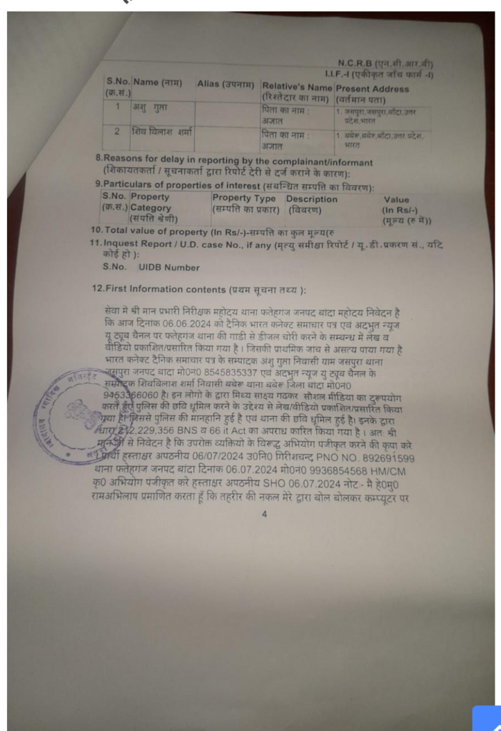 बांदा- फतेहगंज थाना क्षेत्र के अन्तर्गत पुलिस की सरकारी गाड़ी से डीजल चोरी की खबर प्रकाशित करने पर लखनउ से प्रकाशित एक दैनिक समाचार पत्र के जिला संवाददाता अंशू गुप्ता के खिलाफ थाना पुलिस ने भ्रामक खबर प्रकाशित करने का मुकदमा कई धाराअेां में दर्ज किया था। जिस पर वादी ने न्याय की गुहार लगाते हुए माननीय उच्च न्यायालय हाईकोर्ट में याचिका दायर की थी। अंशू गुप्ता की याचिका पर माननीय उच्च न्यायालय इलाहाबाद हाईकोर्ट ने उत्तर प्रदेश के डीजीपी से जवाब मांगा है।